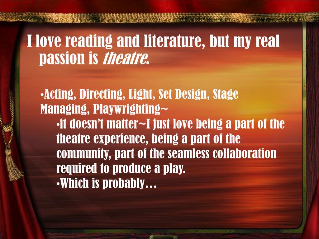 I love reading and literature, but my real passion is theatre. • Acting, Directing, Light, Set Design, Stage Managing, Playwrighting~ • it doesn’t matter~I just love being a part of the theatre experience, being a part of the community, part of the seamless collaboration required to produce a play. • Which is probably…