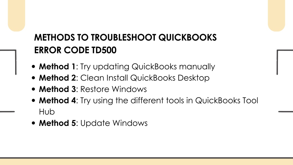 METHODS TO TROUBLESHOOT QUICKBOOKS ERROR CODE TD500 Method 1: Try updating QuickBooks manually Method 2: Clean Install QuickBooks Desktop Method 3: Restore Windows Method 4: Try using the different tools in QuickBooks Tool Hub Method 5: Update Windows