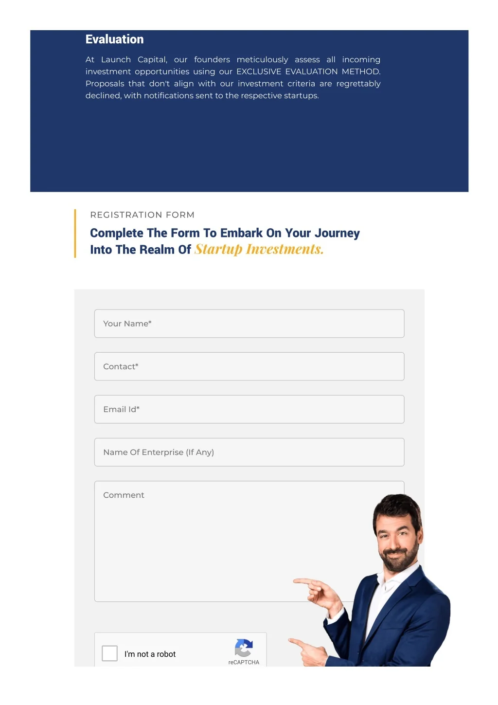 Evaluation At Launch Capital, our founders meticulously assess all incoming investment opportunities using our EXCLUSIVE EVALUATION METHOD. Proposals that don't align with our investment criteria are regrettably declined, with noti?cations sent to the respective startups. REGISTRATION FORM Complete The Form To Embark On Your Journey Into The Realm Of Startup Investments. Your Name* Contact* Email Id* Name Of Enterprise (If Any) Comment I'm not a robot reCAPTCHA