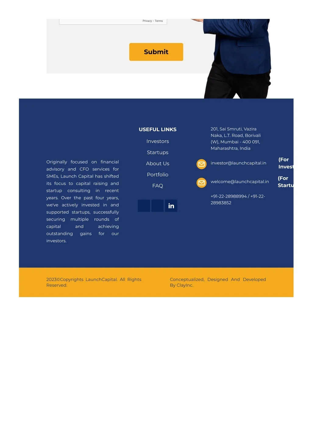 Privacy - Terms Submit 201, Sai Smruti, Vazira Naka, L.T. Road, Borivali (W), Mumbai - 400 091, Maharashtra, India USEFUL LINKS Investors Startups (For Investor) Originally focused on ?nancial investor@launchcapital.in About Us advisory and CFO services for Portfolio SMEs, Launch Capital has shifted (For Startups) welcome@launchcapital.in its focus to capital raising and FAQ startup consulting in recent +91-22-28988994 / +91-22- 28983852 years. Over the past four years, we've actively invested in and supported startups, successfully securing multiple rounds of capital and achieving outstanding gains for our investors. 2023©Copyrights LaunchCapital. All Rights Reserved. Conceptualized, Designed And Developed By ClayInc.