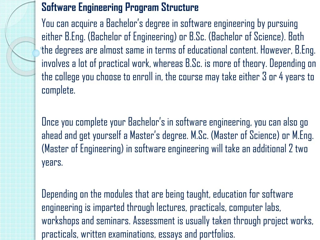 Software Engineering Program Structure You can acquire a Bachelor’s degree in software engineering by pursuing either B.Eng. (Bachelor of Engineering) or B.Sc. (Bachelor of Science). Both the degrees are almost same in terms of educational content. However, B.Eng. involves a lot of practical work, whereas B.Sc. is more of theory. Depending on the college you choose to enroll in, the course may take either 3 or 4 years to complete. Once you complete your Bachelor’s in software engineering, you can also go ahead and get yourself a Master’s degree. M.Sc. (Master of Science) or M.Eng. (Master of Engineering) in software engineering will take an additional 2 two years. Depending on the modules that are being taught, education for software engineering is imparted through lectures, practicals, computer labs, workshops and seminars. Assessment is usually taken through project works, practicals, written examinations, essays and portfolios.