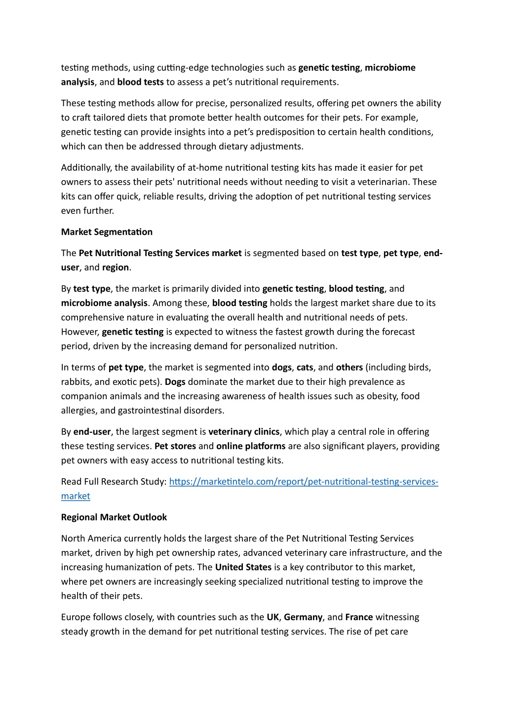 testing methods, using cutting-edge technologies such as genetic testing, microbiome analysis, and blood tests to assess a pet’s nutritional requirements. These testing methods allow for precise, personalized results, offering pet owners the ability to craft tailored diets that promote better health outcomes for their pets. For example, genetic testing can provide insights into a pet’s predisposition to certain health conditions, which can then be addressed through dietary adjustments. Additionally, the availability of at-home nutritional testing kits has made it easier for pet owners to assess their pets' nutritional needs without needing to visit a veterinarian. These kits can offer quick, reliable results, driving the adoption of pet nutritional testing services even further. Market Segmentation The Pet Nutritional Testing Services market is segmented based on test type, pet type, end- user, and region. By test type, the market is primarily divided into genetic testing, blood testing, and microbiome analysis. Among these, blood testing holds the largest market share due to its comprehensive nature in evaluating the overall health and nutritional needs of pets. However, genetic testing is expected to witness the fastest growth during the forecast period, driven by the increasing demand for personalized nutrition. In terms of pet type, the market is segmented into dogs, cats, and others (including birds, rabbits, and exotic pets). Dogs dominate the market due to their high prevalence as companion animals and the increasing awareness of health issues such as obesity, food allergies, and gastrointestinal disorders. By end-user, the largest segment is veterinary clinics, which play a central role in offering these testing services. Pet stores and online platforms are also significant players, providing pet owners with easy access to nutritional testing kits. Read Full Research Study: https://marketintelo.com/report/pet-nutritional-testing-services- market Regional Market Outlook North America currently holds the largest share of the Pet Nutritional Testing Services market, driven by high pet ownership rates, advanced veterinary care infrastructure, and the increasing humanization of pets. The United States is a key contributor to this market, where pet owners are increasingly seeking specialized nutritional testing to improve the health of their pets. Europe follows closely, with countries such as the UK, Germany, and France witnessing steady growth in the demand for pet nutritional testing services. The rise of pet care