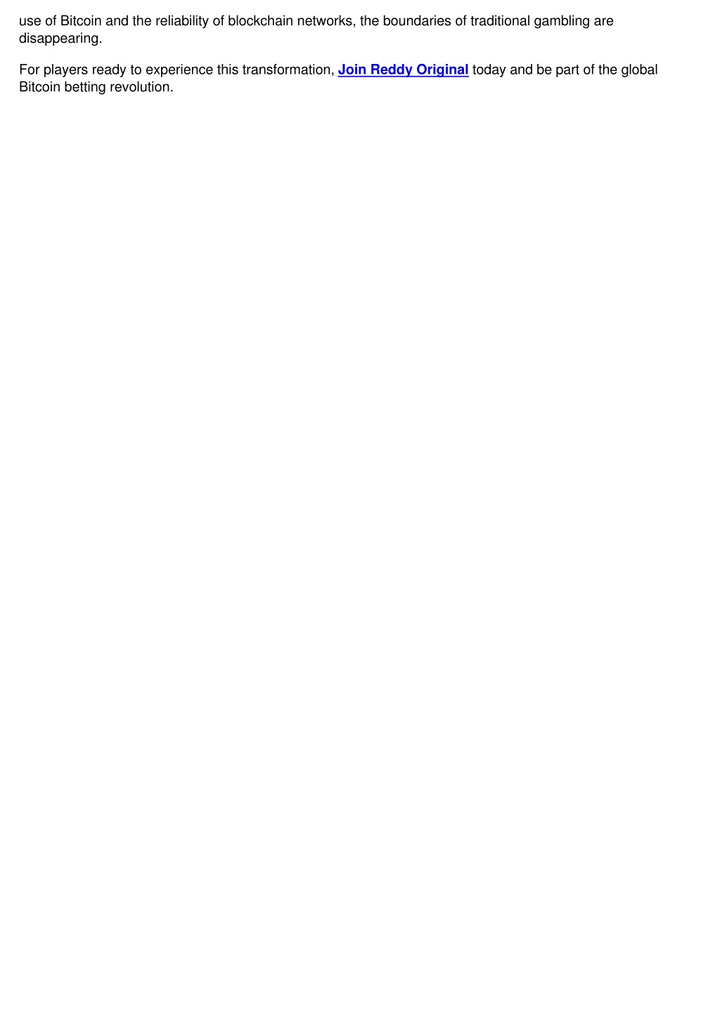 use of Bitcoin and the reliability of blockchain networks, the boundaries of traditional gambling are disappearing. For players ready to experience this transformation, Join Reddy Original today and be part of the global Bitcoin betting revolution.