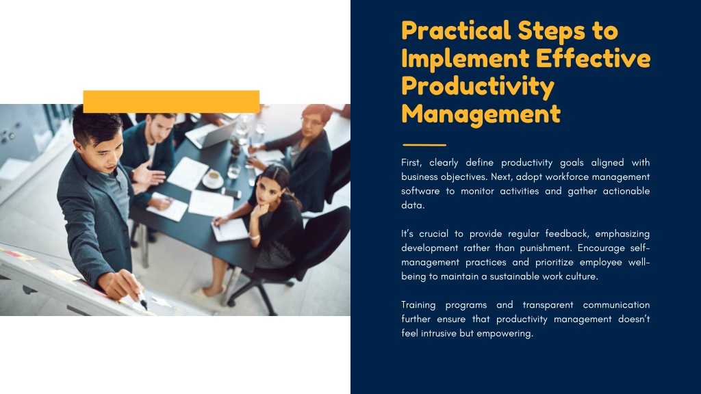 Practical Steps to Implement Effective Productivity Management First, clearly define productivity goals aligned with business objectives. Next, adopt workforce management software to monitor activities and gather actionable data. It’s crucial to provide regular feedback, emphasizing development rather than punishment. Encourage self- management practices and prioritize employee well- being to maintain a sustainable work culture. Training programs and transparent communication further ensure that productivity management doesn’t feel intrusive but empowering.