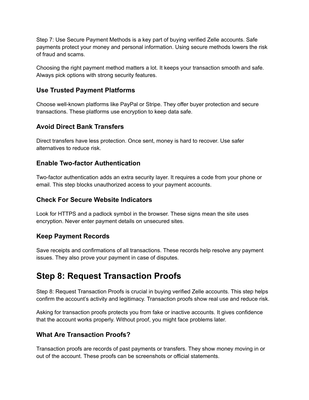 Step 7: Use Secure Payment Methods is a key part of buying verified Zelle accounts. Safe payments protect your money and personal information. Using secure methods lowers the risk of fraud and scams. Choosing the right payment method matters a lot. It keeps your transaction smooth and safe. Always pick options with strong security features. Use Trusted Payment Platforms Choose well-known platforms like PayPal or Stripe. They offer buyer protection and secure transactions. These platforms use encryption to keep data safe. Avoid Direct Bank Transfers Direct transfers have less protection. Once sent, money is hard to recover. Use safer alternatives to reduce risk. Enable Two-factor Authentication Two-factor authentication adds an extra security layer. It requires a code from your phone or email. This step blocks unauthorized access to your payment accounts. Check For Secure Website Indicators Look for HTTPS and a padlock symbol in the browser. These signs mean the site uses encryption. Never enter payment details on unsecured sites. Keep Payment Records Save receipts and confirmations of all transactions. These records help resolve any payment issues. They also prove your payment in case of disputes. Step 8: Request Transaction Proofs Step 8: Request Transaction Proofs is crucial in buying verified Zelle accounts. This step helps confirm the account’s activity and legitimacy. Transaction proofs show real use and reduce risk. Asking for transaction proofs protects you from fake or inactive accounts. It gives confidence that the account works properly. Without proof, you might face problems later. What Are Transaction Proofs? Transaction proofs are records of past payments or transfers. They show money moving in or out of the account. These proofs can be screenshots or official statements.