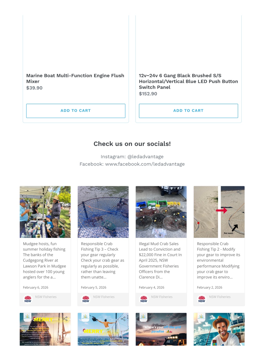 Marine Boat Multi-Function Engine Flush Mixer $39.90 12v~24v 6 Gang Black Brushed S/S Horizontal/Vertical Blue LED Push Button Switch Panel $152.90 ADD TO CART ADD TO CART Check us on our socials! Instagram: @ledadvantage Facebook: www.facebook.com/ledadvantage Mudgee hosts, fun summer holiday ?shing The banks of the Cudgegong River at Lawson Park in Mudgee hosted over 100 young anglers for the a... Responsible Crab Fishing Tip 3 – Check your gear regularly Check your crab gear as regularly as possible, rather than leaving them unatte... Illegal Mud Crab Sales Lead to Conviction and $22,000 Fine in Court In April 2025, NSW Government Fisheries O?cers from the Clarence Di... Responsible Crab Fishing Tip 2 - Modify your gear to improve its environmental performance Modifying your crab gear to improve its enviro... February 6, 2026 February 5, 2026 February 4, 2026 February 2, 2026 NSW Fisheries NSW Fisheries NSW Fisheries NSW Fisheries