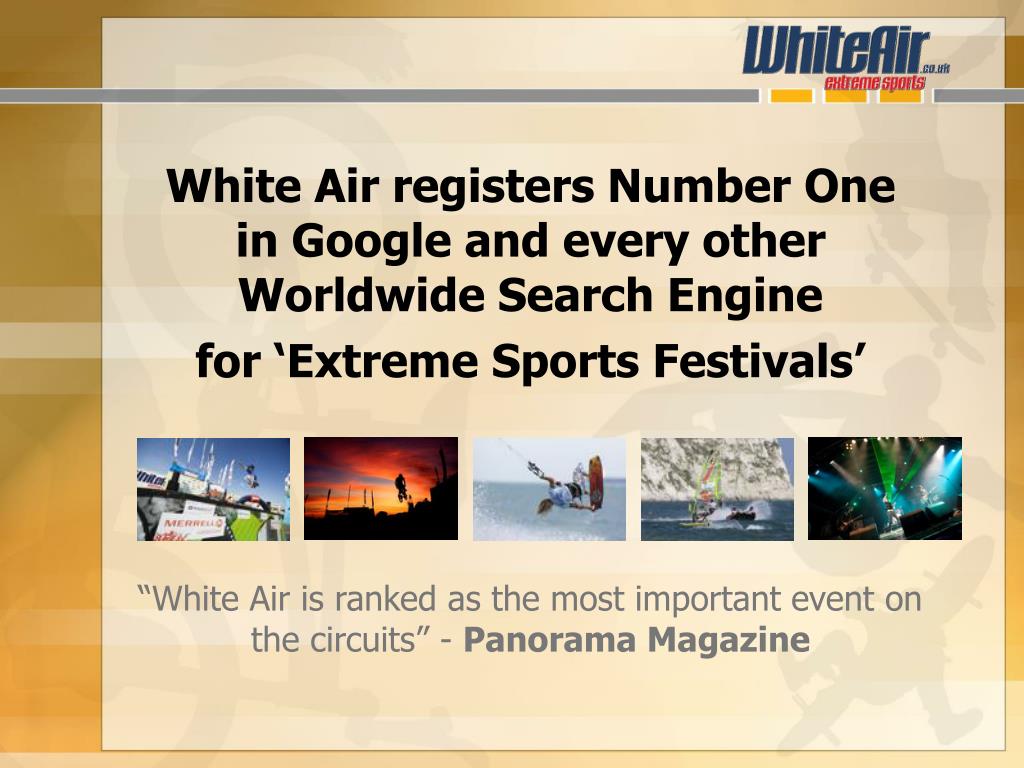 White Air registers Number One in Google and every other Worldwide Search Engine for ‘Extreme Sports Festivals’ “White Air is ranked as the most important event on the circuits” - Panorama Magazine