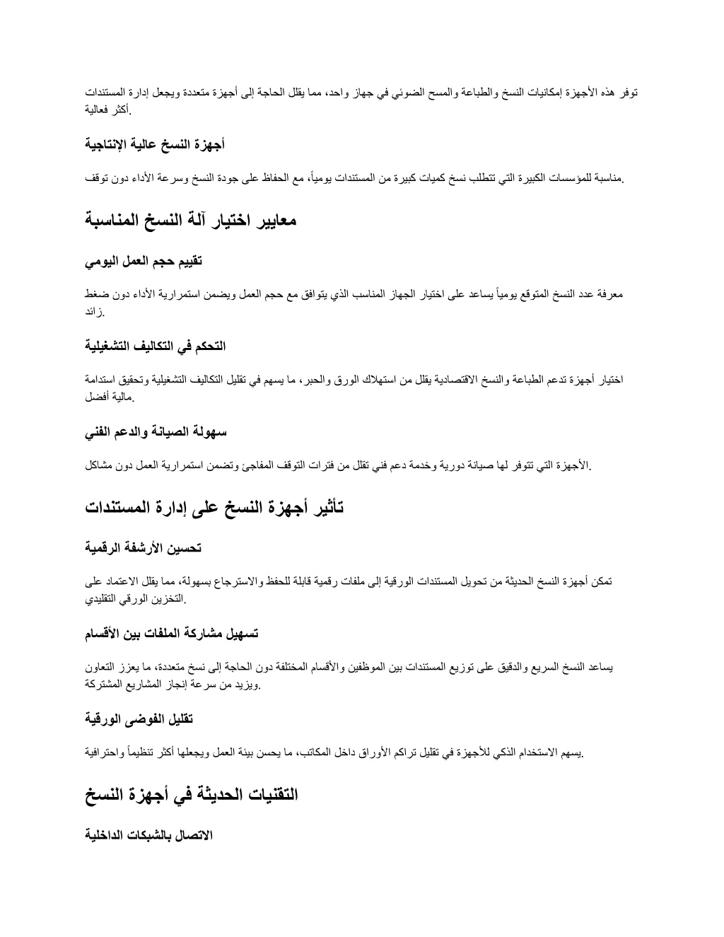 ةرادإو تادﻧﺗﺳﻣﻟا بﺗﺎﻛﻣﻟا ةءﺎﻔﻛ زﯾزﻌﺗﻟ لﻣﺎﻛﺗﻣﻟا لﺣﻟا :نوﻧﺎﻛ ﺦﺳﻧ تﻻآ ،ﺔﺛﯾدﺣﻟا .ءادﻷا ﻊﻣ دﯾازﺗ مﺟﺣ لﺎﻣﻋﻷا ﺔﯾﻣوﯾﻟا عوﻧﺗو مﺎﮭﻣﻟا ،ﺔﯾرادﻹا مﻟ دﻌﺗ ةزﮭﺟأ ﺦﺳﻧﻟا ﺔﯾدﯾﻠﻘﺗﻟا ةردﺎﻗ ﻰﻠﻋ ﺔﯾﺑﻠﺗ تﺎﺟﺎﯾﺗﺣا ﺔﯾﻟﺎﻋ ﺔﻗدو ةزﺎﺗﻣﻣ ﻲﻓ ﺦﺳﻧﻟا ،ﺔﻋﺎﺑطﻟاو لﯾﻠﻘﺗو ،ءﺎطﺧﻷا ﻊﻣ لﻣﻌﻟا ةدوﺟﻟاو ﻲﻓ .ﺔﺛﯾدﺣﻟا جﺎﺗﺣﺗ نﯾﻔظوﻣﻟا نﯾﺳﺣﺗو ةءﺎﻔﻛ رﯾﺳ .لﻣﻌﻟا ةزﮭﺟأ ﺦﺳﻧﻟا ﺔﺛﯾدﺣﻟا تﺣﺑﺻأ تاودأ ﺔﯾﺳﺎﺳأ ةدﺎﯾزﻟ ﺔﯾﺟﺎﺗﻧﻹا نﯾﺳﺣﺗو ةدوﺟ ،تادﻧﺗﺳﻣﻟا ،ﺔﻘﯾﻗد لﺑ مﻋدﺗ ًﺎﺿﯾأ مﯾظﻧﺗﻟا ﻲﻣﻗرﻟا ةرادإو تﺎﻣوﻠﻌﻣﻟا لﺧاد ﺔﺳﺳؤﻣﻟا تادﻧﺗﺳﻣﻟا لﻛﺷﺑ لﺎﻌﻓ نﻣ تﺎﺑﻠطﺗﻣﻟا ﺔﯾﺳﺎﺳﻷا يﻷ ﺔﺳﺳؤﻣ وأ بﺗﻛﻣ ﻰﻌﺳﯾ قﯾﻘﺣﺗﻟ ﺔﯾﺟﺎﺗﻧﻹا ةرادإو مﯾظﻧﺗ ﺢﺑﺻأ ﺔﺋﯾﺑ تﺎﺳﺳؤﻣﻟا ﺔﯾﺟﺎﺗﻧإ ﻲﻓ تﺎﺳﺳؤﻣﻟا ﻰﻟإ ةزﮭﺟأ ﺦﺳﻧ ةروطﺗﻣ رﻓوﺗ ﺔﻋرﺳ مﻋد ﺔﯾﻗرو ﺦﺳﻧ جﺎﺗﻧإ ﻲﻓ طﻘﻓ مﮭﺳﺗ ﻻ ﻲﮭﻓ . تﺎﺳﺳؤﻣﻠﻟ ﻲﺗﻟا ثﺣﺑﺗ نﻋ ءادأ قوﺛوﻣ ةدوﺟو ﺔﯾﻟﺎﻋ ﻲﻓ ﺦﺳﻧﻟا .ﺔﻋﺎﺑطﻟاو رﻓوﺗ هذھ ةزﮭﺟﻷا ﺔﻋرﺳ ،ﺔﯾﻠﺧادﻟا ﺎﻣ لﮭﺳﯾ ﺔﻛرﺎﺷﻣ تادﻧﺗﺳﻣﻟا نﯾﺑ مﺎﺳﻗﻷا تﻻآ ﺔﻘﺋﺎﻓ .ﺔﻔﻠﺗﺧﻣﻟا ﺎﻣﻛ دﻋﺎﺳﺗ ﻲﻓ لﯾﻠﻘﺗ فﯾﻟﺎﻛﺗﻟا ﺔﯾﻠﯾﻐﺷﺗﻟا لﺿﻔﺑ كﻼﮭﺗﺳا قروﻟا رﺑﺣﻟاو لﻛﺷﺑ ،يدﺎﺻﺗﻗا نﻣﺿﺗو ﺔﯾرارﻣﺗﺳا لﻣﻌﻟا نود فﻗوﺗ ًارﺎﻣﺛﺗﺳا ًﻻﺎﻌﻓ زﯾزﻌﺗﻟ ﺔﯾﺟﺎﺗﻧإ تﺎﺳﺳؤﻣﻟا نﯾﺳﺣﺗو ﺔﺋﯾﺑ لﻣﻌﻟا لﻛﺷﺑ مﺎﻋ لﺛﻣﻷا تازﯾﻣ رﺎﯾﺧﻟا نوﻧﺎﻛ ،ةزﺎﺗﻣﻣ ﻊﻣ ﺦﺳﻧ ﺔﻗدو دﻌُﺗ تﺎﻛﺑﺷﻟا ﻲﺋوﺿﻟا رﺑﻋ ﺢﺳﻣﻟاو ﺔﻋﺎﺑطﻟا لﺛﻣ ﺔﯾﻛذ ﺎﮭﻠﻌﺟﯾ ،ررﻛﺗﻣ ﺎﻣ . ﺔﺛﯾدﺣﻟا تﺎﺳﺳؤﻣﻟا ﺦﺳﻧﻟا ﻲﻓ ةزﮭﺟأ ﺔﯾﻣھأ ﺔﯾﻣوﯾﻟا لﺎﻣﻋﻷا زﺎﺟﻧإ ﻊﯾرﺳﺗ ،ﺔﻋرﺳﺑ ﺎﻣﻣ لﻠﻘﯾ تﻗو رﺎظﺗﻧﻻا دﯾزﯾو نﻣ ،مﮭﺗﯾﺟﺎﺗﻧإ ﺢﯾﺗﯾو مﮭﻟ زﯾﻛرﺗﻟا ﻰﻠﻋ مﺎﮭﻣﻟا ﺔﯾﺳﺎﺳﻷا . تادﻧﺗﺳﻣﻟا نﯾﻔظوﻣﻟا نﻣ جﺎﺗﻧإ ﺔﺛﯾدﺣﻟا ﺦﺳﻧﻟا ةزﮭﺟأ نّﻛﻣﺗ تادﻧﺗﺳﻣﻟا ةدوﺟ نﺎﻣﺿ ،تﺎﻣوﺳرﻟاو ﺎﻣﻣ نﻣﺿﯾ جﺎﺗﻧإ تادﻧﺗﺳﻣ ﺔﯾﻟﺎﻋ ةدوﺟﻟا ﻲﺑﻠﺗ رﯾﯾﺎﻌﻣﻟا ﺔﯾﻣﺳرﻟا ﺔﯾرادﻹاو ﺔﺳﺳؤﻣﻠﻟ . صوﺻﻧﻟا ﺔﻗدو روﺻﻟا حوﺿو ﻰﻠﻋ نوﻧﺎﻛ ﺦﺳﻧ ةزﮭﺟأ ظﻓﺎﺣﺗ نﯾﻔظوﻣﻟا ﻰﻠﻋ طﻐﺿﻟا لﯾﻠﻘﺗ دﺎﻣﺗﻋﻻا ﻰﻠﻋ ةزﮭﺟأ ﺔﻟﺎﻌﻓ لﻠﻘﯾ نﻣ لﺎطﻋﻷا ،ةررﻛﺗﻣﻟا ﺎﻣ ﺢﻧﻣﯾ نﯾﻔظوﻣﻟا ًﺎﺗﻗو رﺑﻛأ زﯾﻛرﺗﻠﻟ ﻰﻠﻋ مﮭﻣﺎﮭﻣ ﺔﯾﺳﺎﺳﻷا نود لﯾطﻌﺗ رﯾﺳ لﻣﻌﻟا. ﺔﺳﺳؤﻣﻟا تﺎﺟﺎﯾﺗﺣا قﻓو نوﻧﺎﻛ ﺦﺳﻧ تﻻآ عاوﻧأ ﺔﯾﺑﺗﻛﻣﻟا ﺦﺳﻧﻟا ةزﮭﺟأ ﺔطﺳوﺗﻣﻟاو ﻲﺗﻟا جﺎﺗﺣﺗ ﻰﻟإ ﺦﺳﻧ ﺔﯾﻣوﯾ ،ﺔﻣظﺗﻧﻣ ﻊﻣ ءادأ تﺑﺎﺛ قوﺛوﻣو ﺔﯾﺑﻠﺗﻟ تﺎﺟﺎﯾﺗﺣا لﻣﻌﻟا ﺔﯾﻣوﯾﻟا ةرﯾﻐﺻﻟا بﺗﺎﻛﻣﻠﻟ ﺔﯾﻟﺎﺛﻣ . فﺋﺎظوﻟا ةددﻌﺗﻣ ﺦﺳﻧﻟا ةزﮭﺟأ