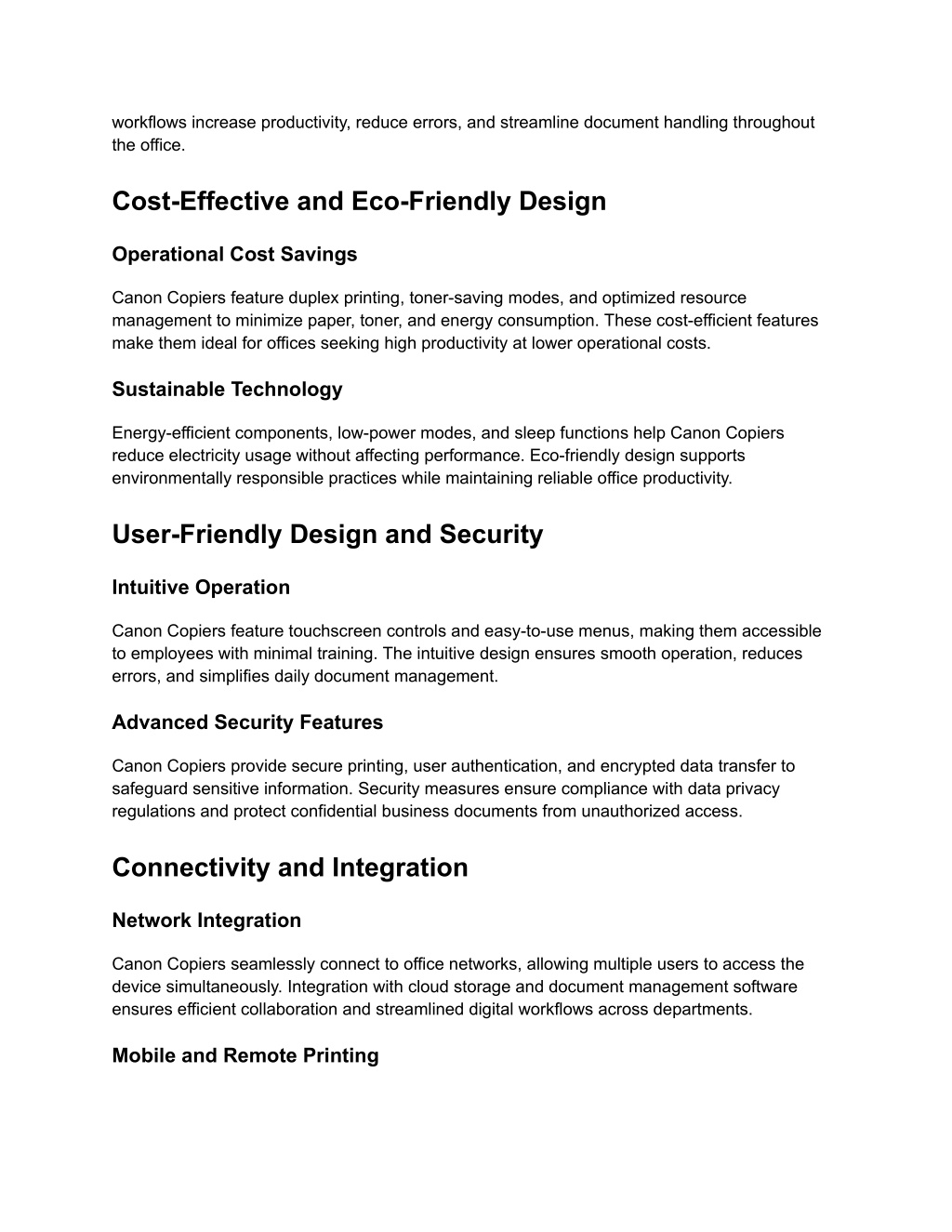 workflows increase productivity, reduce errors, and streamline document handling throughout the office. Cost-Effective and Eco-Friendly Design Operational Cost Savings Canon Copiers feature duplex printing, toner-saving modes, and optimized resource management to minimize paper, toner, and energy consumption. These cost-efficient features make them ideal for offices seeking high productivity at lower operational costs. Sustainable Technology Energy-efficient components, low-power modes, and sleep functions help Canon Copiers reduce electricity usage without affecting performance. Eco-friendly design supports environmentally responsible practices while maintaining reliable office productivity. User-Friendly Design and Security Intuitive Operation Canon Copiers feature touchscreen controls and easy-to-use menus, making them accessible to employees with minimal training. The intuitive design ensures smooth operation, reduces errors, and simplifies daily document management. Advanced Security Features Canon Copiers provide secure printing, user authentication, and encrypted data transfer to safeguard sensitive information. Security measures ensure compliance with data privacy regulations and protect confidential business documents from unauthorized access. Connectivity and Integration Network Integration Canon Copiers seamlessly connect to office networks, allowing multiple users to access the device simultaneously. Integration with cloud storage and document management software ensures efficient collaboration and streamlined digital workflows across departments. Mobile and Remote Printing