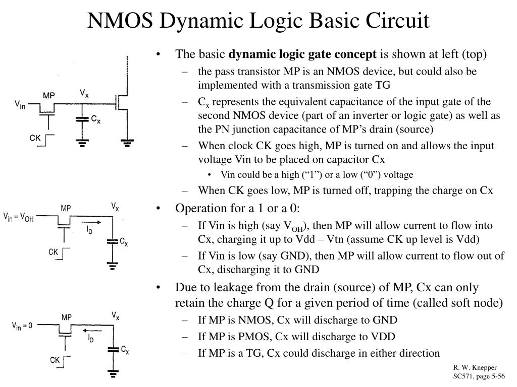 NMOS Dynamic Logic Basic Circuit • The basic dynamic logic gateconcept is shown at left (top) • the pass transistor MP is an NMOS device, but could also be implemented with a transmission gate TG • Cx represents the equivalent capacitance of the input gate of the second NMOS device (part of an inverter or logic gate) as well as the PN junction capacitance of MP’s drain (source) • When clock CK goes high, MP is turned on and allows the input voltage Vin to be placed on capacitor Cx • Vin could be a high (“1”) or a low (“0”) voltage • When CK goes low, MP is turned off, trapping the charge on Cx • Operation for a 1 or a 0: • If Vin is high (say VOH), then MP will allow current to flow into Cx, charging it up to Vdd – Vtn (assume CK up level is Vdd) • If Vin is low (say GND), then MP will allow current to flow out of Cx, discharging it to GND • Due to leakage from the drain (source) of MP, Cx can only retain the charge Q for a given period of time (called soft node) • If MP is NMOS, Cx will discharge to GND • If MP is PMOS, Cx will discharge to VDD • If MP is a TG, Cx could discharge in either direction R. W. Knepper SC571, page 5-56