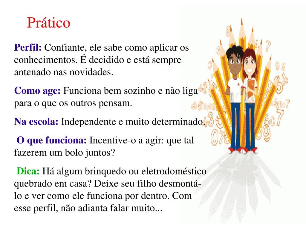 Prático Perfil: Confiante, ele sabe como aplicar os conhecimentos. É decidido e está sempre antenado nas novidades. Como age: Funciona bem sozinho e não liga para o que os outros pensam. Na escola: Independente e muito determinado. O que funciona: Incentive-o a agir: que tal fazerem um bolo juntos? Dica: Há algum brinquedo ou eletrodoméstico quebrado em casa? Deixe seu filho desmontá-lo e ver como ele funciona por dentro. Com esse perfil, não adianta falar muito...