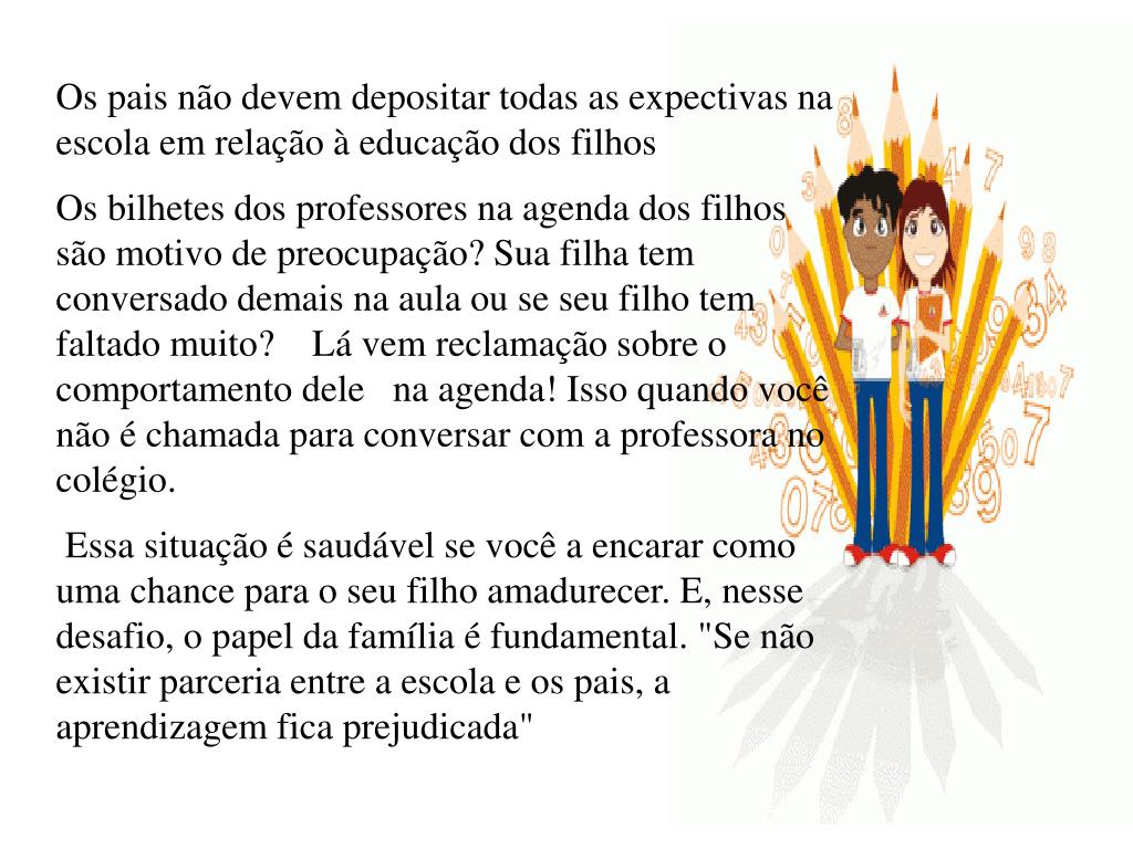 Os pais não devem depositar todas as expectivas na escola em relação à educação dos filhos Os bilhetes dos professores na agenda dos filhos são motivo de preocupação? Sua filha tem conversado demais na aula ou se seu filho tem faltado muito? Lá vem reclamação sobre o comportamento dele na agenda! Isso quando você não é chamada para conversar com a professora no colégio. Essa situação é saudável se você a encarar como uma chance para o seu filho amadurecer. E, nesse desafio, o papel da família é fundamental. "Se não existir parceria entre a escola e os pais, a aprendizagem fica prejudicada"