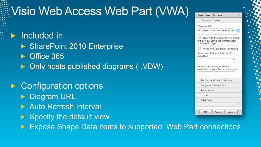 Visio Web Access Web Part (VWA) • Included in • SharePoint 2010 Enterprise • Office 365 • Only hosts published diagrams ( .VDW) • Configuration options • Diagram URL • Auto Refresh Interval • Specify the default view • Expose Shape Data items to supported Web Part connections