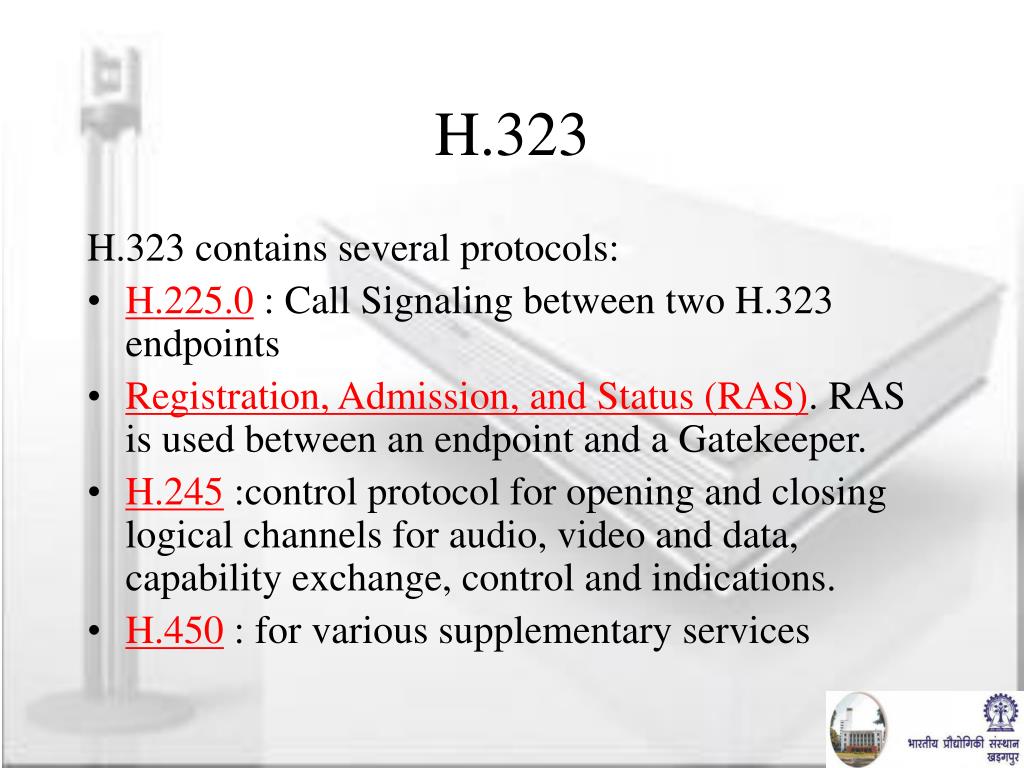 H.323 H.323 contains several protocols: • H.225.0 : Call Signaling between two H.323 endpoints • Registration, Admission, and Status (RAS). RAS is used between an endpoint and a Gatekeeper. • H.245 :control protocol for opening and closing logical channels for audio, video and data, capability exchange, control and indications. • H.450 : for various supplementary services