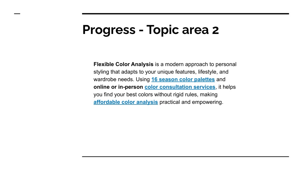 Progress - Topic area 2 Flexible Color Analysis is a modern approach to personal styling that adapts to your unique features, lifestyle, and wardrobe needs. Using 16 season color palettes and online or in-person color consultation services, it helps you find your best colors without rigid rules, making affordable color analysis practical and empowering.