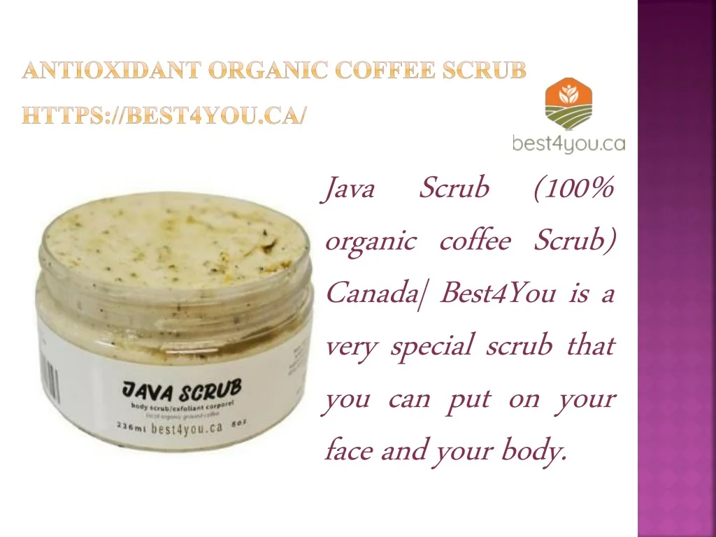 Antioxidant organic coffee Scrubhttps://best4you.ca/ Java Scrub (100% organic coffee Scrub) Canada| Best4You is a very special scrub that you can put on your face and your body.