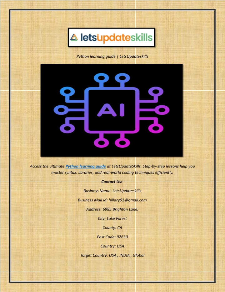 1. Python learning guide | LetsUpdateskills Access the ultimate Python learning guide at LetsUpdateSkills. Step-by-step lessons help you master syntax, libraries, and real-world coding techniques efficiently. Contact Us:- Business Name: LetsUpdateskills Business Mail Id: hillary61@gmail.com Address: 6985 Brighton Lane, City: Lake Forest County: CA Post Code: 92630 Country: USA Target Country: USA , INDIA , Global