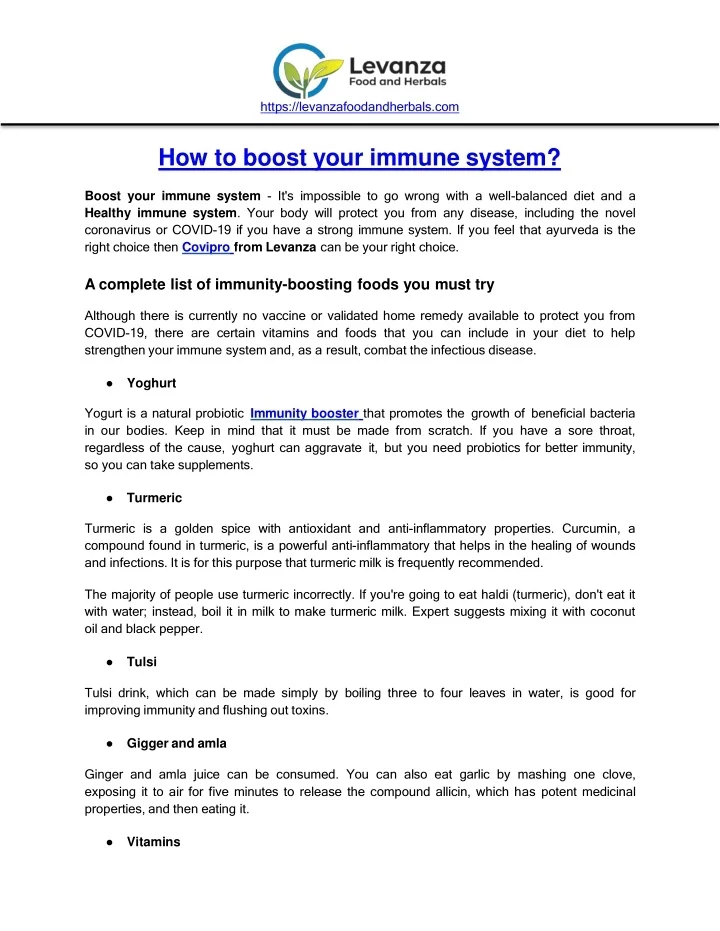 https://levanzafoodandherbals.com • Howto boost your immunesystem? • Boost your immune system - It's impossible to go wrong with a well-balanced diet and a Healthy immune system. Your body will protect you from any disease, including the novel coronavirus or COVID-19 if you have a strong immune system. If you feel that ayurveda is the rightchoicethenCoviprofromLevanzacanbe yourrightchoice. • Acompletelistofimmunity-boostingfoodsyoumust try • Although there is currently no vaccine or validated home remedy available to protect you from COVID-19,there arecertainvitaminsandfoodsthatyoucanincludein yourdiettohelp strengthenyourimmunesystemand,asaresult,combattheinfectiousdisease. • Yoghurt • Yogurtisa natural probioticImmunity boosterthat promotes thegrowth ofbeneficial bacteria in our bodies. Keep in mind that it must be made from scratch. Ifyou have a sore throat, regardless of the cause,yoghurt can aggravateit,but you need probiotics for better immunity, soyoucantakesupplements. • Turmeric • Turmericisagoldenspicewith antioxidantandanti-inflammatoryproperties.Curcumin, a compound found in turmeric, is a powerful anti-inflammatory that helps in the healing of wounds andinfections.Itisforthis purposethatturmericmilkisfrequentlyrecommended. • The majority of people use turmeric incorrectly. If you're going to eat haldi (turmeric), don't eat it withwater;instead,boilitinmilktomaketurmericmilk.Expertsuggestsmixingitwithcoconut oiland blackpepper. • Tulsi • Tulsi drink, which can be made simply by boiling three tofour leaves in water, is good for improving immunityandflushingouttoxins. • Giggerandamla • Gingerandamlajuice canbe consumed.Youcanalso eatgarlicbymashingoneclove, exposing it to air for five minutes to release the compound allicin, which has potent medicinal properties,andtheneatingit. • Vitamins