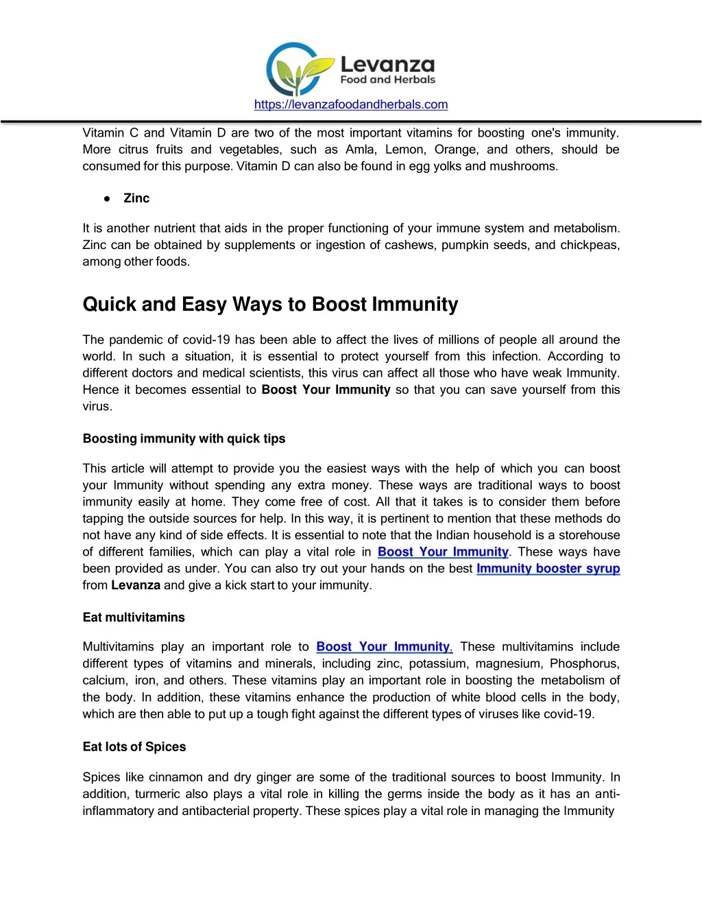 https://levanzafoodandherbals.com • Vitamin C and Vitamin D are twoof the most importantvitamins for boostingone's immunity. More citrusfruitsandvegetables, such asAmla, Lemon,Orange, andothers,shouldbe consumed forthispurpose.VitaminDcanalsobefoundineggyolksandmushrooms. • Zinc • It is another nutrient that aids in the proper functioning of your immune system and metabolism. Zinc can be obtained by supplements or ingestion of cashews, pumpkin seeds, and chickpeas, among otherfoods. • Quickand EasyWaystoBoostImmunity • The pandemic of covid-19 has been able to affect the lives of millions of people all around the world. In such a situation, it is essential to protect yourself from this infection. According to different doctors and medical scientists, this virus can affect all those who have weak Immunity. Hence it becomes essential to Boost Your Immunity so that you can save yourself from this virus. • Boosting immunitywith quicktips • This article willattempt toprovide youthe easiest ways withthehelp ofwhich youcan boost your Immunity without spending any extra money. These ways are traditional ways to boost immunity easily at home. They come free of cost. All that it takes is to consider them before tapping the outside sources for help. In this way, it is pertinent to mention that these methods do not have any kind of side effects. It is essential to note that the Indian household is a storehouse of different families, whichcan play a vital roleinBoost Your Immunity. These ways have been provided as under.You can also try out your hands on the best Immunity booster syrup fromLevanza andgive akickstart toyourimmunity. • Eatmultivitamins • Multivitamins playan importantroleto Boost Your Immunity. Thesemultivitaminsinclude different types of vitamins and minerals, including zinc, potassium, magnesium, Phosphorus, calcium,iron, and others. These vitamins play an important role in boosting themetabolism of the body. In addition, these vitamins enhance the production of white blood cells in the body, which arethenabletoputup atoughfightagainstthedifferenttypesofviruseslikecovid-19. • EatlotsofSpices • Spices like cinnamon and dry ginger are some of the traditional sources to boost Immunity. In addition, turmeric also plays a vital role in killing the germs inside the body as it has an anti- inflammatoryandantibacterialproperty.Thesespicesplay avitalroleinmanagingtheImmunity