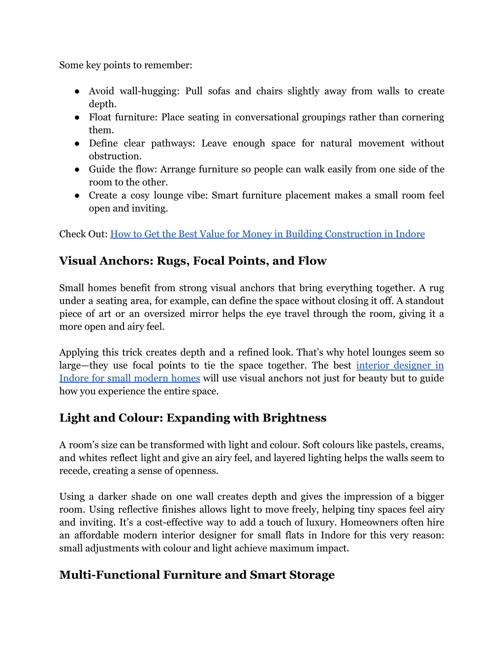 2. Some key points to remember: ● Avoid wall-hugging: Pull sofas and chairs slightly away from walls to create depth. ● Float furniture: Place seating in conversational groupings rather than cornering them. ● Define clear pathways: Leave enough space for natural movement without obstruction. ● Guide the flow: Arrange furniture so people can walk easily from one side of the room to the other. ● Create a cosy lounge vibe: Smart furniture placement makes a small room feel open and inviting. Check Out: How to Get the Best Value for Money in Building Construction in Indore Visual Anchors: Rugs, Focal Points, and Flow Small homes benefit from strong visual anchors that bring everything together. A rug under a seating area, for example, can define the space without closing it off. A standout piece of art or an oversized mirror helps the eye travel through the room, giving it a more open and airy feel. Applying this trick creates depth and a refined look. That’s why hotel lounges seem so large—they use focal points to tie the space together. The best interior designer in Indore for small modern homes will use visual anchors not just for beauty but to guide how you experience the entire space. Light and Colour: Expanding with Brightness A room’s size can be transformed with light and colour. Soft colours like pastels, creams, and whites reflect light and give an airy feel, and layered lighting helps the walls seem to recede, creating a sense of openness. Using a darker shade on one wall creates depth and gives the impression of a bigger room. Using reflective finishes allows light to move freely, helping tiny spaces feel airy and inviting. It’s a cost-effective way to add a touch of luxury. Homeowners often hire an affordable modern interior designer for small flats in Indore for this very reason: small adjustments with colour and light achieve maximum impact. Multi-Functional Furniture and Smart Storage