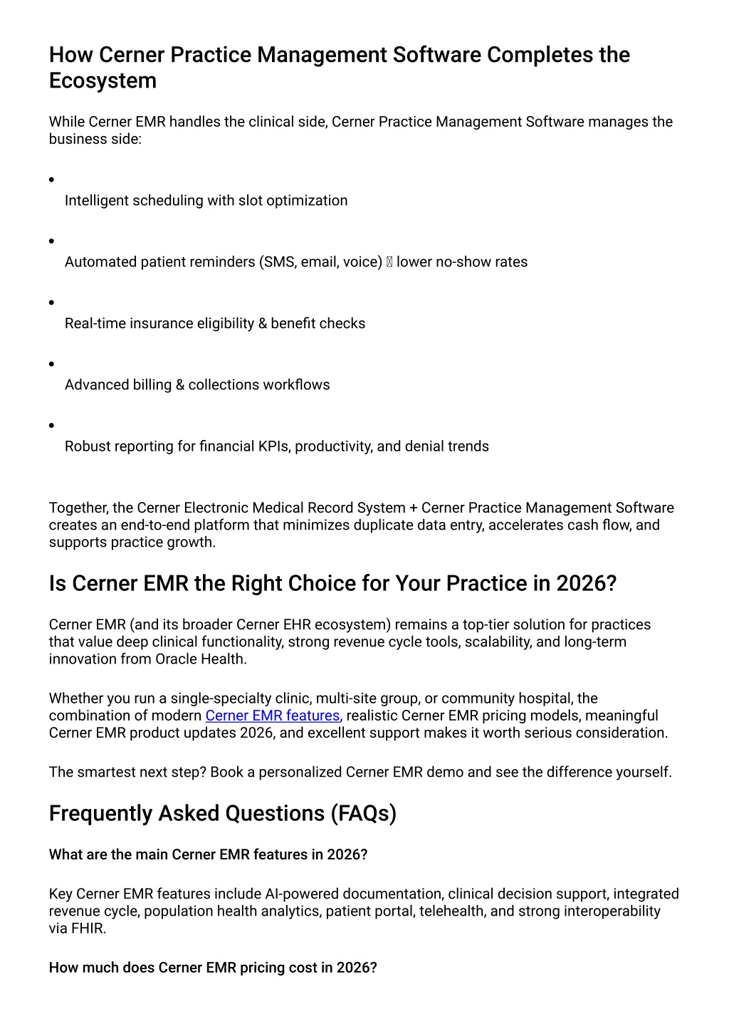 How Cerner Practice Management Software Completes the Ecosystem While Cerner EMR handles the clinical side, Cerner Practice Management Software manages the business side: Intelligent scheduling with slot optimization Automated patient reminders (SMS, email, voice) ? lower no-show rates Real-time insurance eligibility & benefit checks Advanced billing & collections workflows Robust reporting for financial KPIs, productivity, and denial trends Together, the Cerner Electronic Medical Record System + Cerner Practice Management Software creates an end-to-end platform that minimizes duplicate data entry, accelerates cash flow, and supports practice growth. Is Cerner EMR the Right Choice for Your Practice in 2026? Cerner EMR (and its broader Cerner EHR ecosystem) remains a top-tier solution for practices that value deep clinical functionality, strong revenue cycle tools, scalability, and long-term innovation from Oracle Health. Whether you run a single-specialty clinic, multi-site group, or community hospital, the combination of modern Cerner EMR features, realistic Cerner EMR pricing models, meaningful Cerner EMR product updates 2026, and excellent support makes it worth serious consideration. The smartest next step? Book a personalized Cerner EMR demo and see the difference yourself. Frequently Asked Questions (FAQs) What are the main Cerner EMR features in 2026? Key Cerner EMR features include AI-powered documentation, clinical decision support, integrated revenue cycle, population health analytics, patient portal, telehealth, and strong interoperability via FHIR. How much does Cerner EMR pricing cost in 2026?