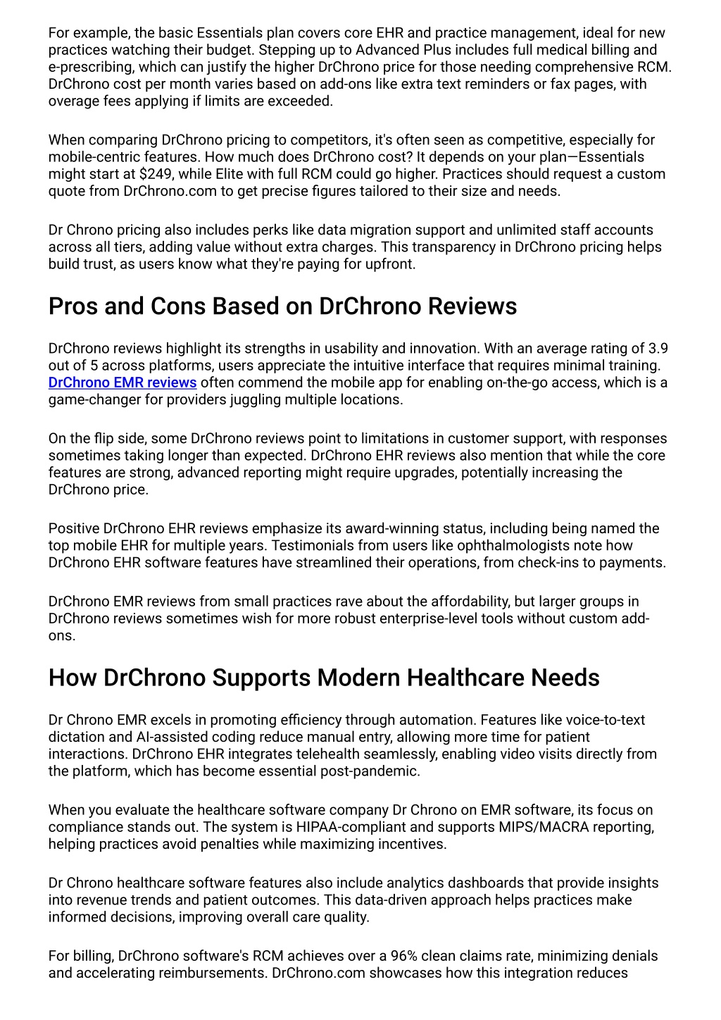 For example, the basic Essentials plan covers core EHR and practice management, ideal for new practices watching their budget. Stepping up to Advanced Plus includes full medical billing and e-prescribing, which can justify the higher DrChrono price for those needing comprehensive RCM. DrChrono cost per month varies based on add-ons like extra text reminders or fax pages, with overage fees applying if limits are exceeded. When comparing DrChrono pricing to competitors, it's often seen as competitive, especially for mobile-centric features. How much does DrChrono cost? It depends on your plan—Essentials might start at $249, while Elite with full RCM could go higher. Practices should request a custom quote from DrChrono.com to get precise figures tailored to their size and needs. Dr Chrono pricing also includes perks like data migration support and unlimited staff accounts across all tiers, adding value without extra charges. This transparency in DrChrono pricing helps build trust, as users know what they're paying for upfront. Pros and Cons Based on DrChrono Reviews DrChrono reviews highlight its strengths in usability and innovation. With an average rating of 3.9 out of 5 across platforms, users appreciate the intuitive interface that requires minimal training. DrChrono EMR reviews often commend the mobile app for enabling on-the-go access, which is a game-changer for providers juggling multiple locations. On the flip side, some DrChrono reviews point to limitations in customer support, with responses sometimes taking longer than expected. DrChrono EHR reviews also mention that while the core features are strong, advanced reporting might require upgrades, potentially increasing the DrChrono price. Positive DrChrono EHR reviews emphasize its award-winning status, including being named the top mobile EHR for multiple years. Testimonials from users like ophthalmologists note how DrChrono EHR software features have streamlined their operations, from check-ins to payments. DrChrono EMR reviews from small practices rave about the affordability, but larger groups in DrChrono reviews sometimes wish for more robust enterprise-level tools without custom add- ons. How DrChrono Supports Modern Healthcare Needs Dr Chrono EMR excels in promoting efficiency through automation. Features like voice-to-text dictation and AI-assisted coding reduce manual entry, allowing more time for patient interactions. DrChrono EHR integrates telehealth seamlessly, enabling video visits directly from the platform, which has become essential post-pandemic. When you evaluate the healthcare software company Dr Chrono on EMR software, its focus on compliance stands out. The system is HIPAA-compliant and supports MIPS/MACRA reporting, helping practices avoid penalties while maximizing incentives. Dr Chrono healthcare software features also include analytics dashboards that provide insights into revenue trends and patient outcomes. This data-driven approach helps practices make informed decisions, improving overall care quality. For billing, DrChrono software's RCM achieves over a 96% clean claims rate, minimizing denials and accelerating reimbursements. DrChrono.com showcases how this integration reduces