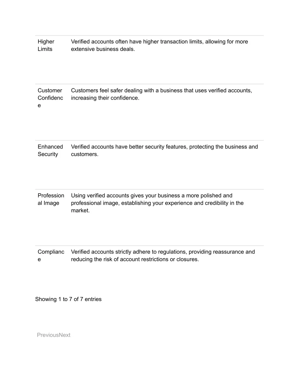 Higher Limits Verified accounts often have higher transaction limits, allowing for more extensive business deals. Customer Confidenc e Customers feel safer dealing with a business that uses verified accounts, increasing their confidence. Enhanced Security Verified accounts have better security features, protecting the business and customers. Profession al Image Using verified accounts gives your business a more polished and professional image, establishing your experience and credibility in the market. Complianc e Verified accounts strictly adhere to regulations, providing reassurance and reducing the risk of account restrictions or closures. Showing 1 to 7 of 7 entries PreviousNext