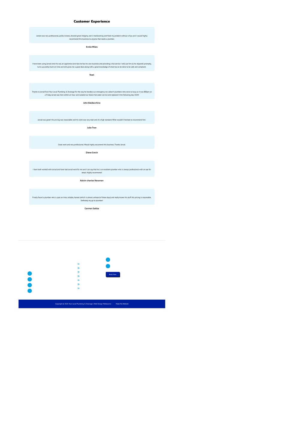 Customer Experience Jordan was very professional, polite, honest, showed great integrity, and is hardworking and ?xed my problem without a fuss and I would highly recommend this business to anyone that needs a plumber. Emile Miles I have been using Jarrad since he was an apprentice and now he has his own business and providing a full service I still use him as he responds promptly, turns up pretty much on time and still gives me a good deal along with a great knowledge of what has to be done to be safe and compliant. Noel Thanks to Jarrad from Your Local Plumbing & Drainage for the way he handles our emergency we called 4 plumbers who were to busy as it was 800pm on a Friday. Jarrad was here within an hour and isolated our blown hot water service and replaced it the following day. 10/10 John Baldacchino Jarrad was great! His pricing was reasonable and his work was very neat and of a high standard. What wouldn’t hesitate to recommend him. Julie Tran Great work and very professional. Would highly reccomend this business. Thanks Jarrad. Diane Grech I have both worked with Jarrad and have had Jarrad work for me and I can say that he is an excellent plumber who is always professional with an eye for detail. Highly recommend! Kelvin charles Newman Finally found a plumber who is spot on time, reliable, honest (which is almost unheard of these days) and really knows his stuff. His pricing is reasonable. De?nitely my go to plumber! Carmen Saliba Useful Links @Yourlocalplumbing Services @yourlocalplumbing FAQs We Accept: Blog 1800 962 224 Book Now Locations admin@yourlocalplumbing.com.au LIC NO: 110483 Privacy Policy Terms & Conditions Melbourne, Victoria, Australia Sitemap Geelong, Victoria, Australia Copyright © 2025 Your Local Plumbing & Drainage | Web Design Melbourne - Make My Website