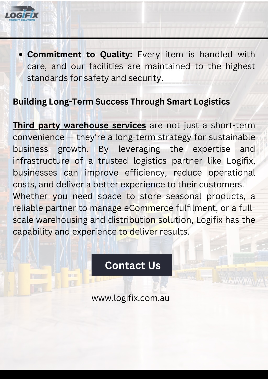 Commitment to Quality: Every item is handled with care, and our facilities are maintained to the highest standards for safety and security. Building Long-Term Success Through Smart Logistics Third party warehouse services are not just a short-term convenience — they’re a long-term strategy for sustainable business growth. By leveraging the expertise and infrastructure of a trusted logistics partner like Logifix, businesses can improve efficiency, reduce operational costs, and deliver a better experience to their customers. Whether you need space to store seasonal products, a reliable partner to manage eCommerce fulfilment, or a full- scale warehousing and distribution solution, Logifix has the capability and experience to deliver results. Contact Us www.logifix.com.au