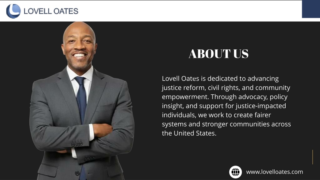 ABOUT US Lovell Oates is dedicated to advancing justice reform, civil rights, and community empowerment. Through advocacy, policy insight, and support for justice-impacted individuals, we work to create fairer systems and stronger communities across the United States. 01 02 www.lovelloates.com