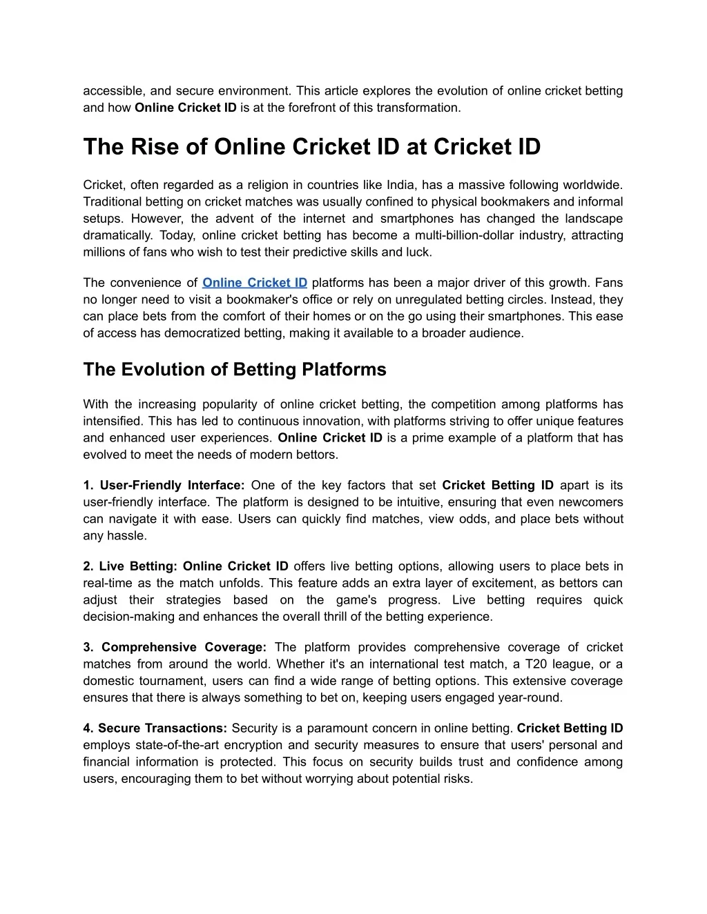 accessible, and secure environment. This article explores the evolution of online cricket betting and how Online Cricket ID is at the forefront of this transformation. The Rise of Online Cricket ID at Cricket ID Cricket, often regarded as a religion in countries like India, has a massive following worldwide. Traditional betting on cricket matches was usually confined to physical bookmakers and informal setups. However, the advent of the internet and smartphones has changed the landscape dramatically. Today, online cricket betting has become a multi-billion-dollar industry, attracting millions of fans who wish to test their predictive skills and luck. The convenience of Online Cricket ID platforms has been a major driver of this growth. Fans no longer need to visit a bookmaker's office or rely on unregulated betting circles. Instead, they can place bets from the comfort of their homes or on the go using their smartphones. This ease of access has democratized betting, making it available to a broader audience. The Evolution of Betting Platforms With the increasing popularity of online cricket betting, the competition among platforms has intensified. This has led to continuous innovation, with platforms striving to offer unique features and enhanced user experiences. Online Cricket ID is a prime example of a platform that has evolved to meet the needs of modern bettors. 1. User-Friendly Interface: One of the key factors that set Cricket Betting ID apart is its user-friendly interface. The platform is designed to be intuitive, ensuring that even newcomers can navigate it with ease. Users can quickly find matches, view odds, and place bets without any hassle. 2. Live Betting: Online Cricket ID offers live betting options, allowing users to place bets in real-time as the match unfolds. This feature adds an extra layer of excitement, as bettors can adjust their strategies based on the game's progress. Live betting requires quick decision-making and enhances the overall thrill of the betting experience. 3. Comprehensive Coverage: The platform provides comprehensive coverage of cricket matches from around the world. Whether it's an international test match, a T20 league, or a domestic tournament, users can find a wide range of betting options. This extensive coverage ensures that there is always something to bet on, keeping users engaged year-round. 4. Secure Transactions: Security is a paramount concern in online betting. Cricket Betting ID employs state-of-the-art encryption and security measures to ensure that users' personal and financial information is protected. This focus on security builds trust and confidence among users, encouraging them to bet without worrying about potential risks.