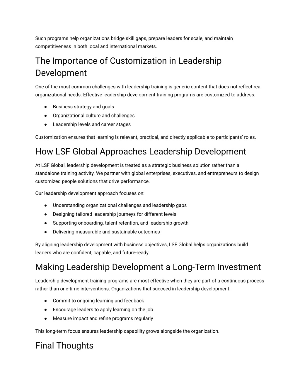 Such programs help organizations bridge skill gaps, prepare leaders for scale, and maintain competitiveness in both local and international markets. The Importance of Customization in Leadership Development One of the most common challenges with leadership training is generic content that does not reflect real organizational needs. Effective leadership development training programs are customized to address: Business strategy and goals ● Organizational culture and challenges ● Leadership levels and career stages ● Customization ensures that learning is relevant, practical, and directly applicable to participants’ roles. How LSF Global Approaches Leadership Development At LSF Global, leadership development is treated as a strategic business solution rather than a standalone training activity. We partner with global enterprises, executives, and entrepreneurs to design customized people solutions that drive performance. Our leadership development approach focuses on: Understanding organizational challenges and leadership gaps ● Designing tailored leadership journeys for different levels ● Supporting onboarding, talent retention, and leadership growth ● Delivering measurable and sustainable outcomes ● By aligning leadership development with business objectives, LSF Global helps organizations build leaders who are confident, capable, and future-ready. Making Leadership Development a Long-Term Investment Leadership development training programs are most effective when they are part of a continuous process rather than one-time interventions. Organizations that succeed in leadership development: Commit to ongoing learning and feedback ● Encourage leaders to apply learning on the job ● Measure impact and refine programs regularly ● This long-term focus ensures leadership capability grows alongside the organization. Final Thoughts