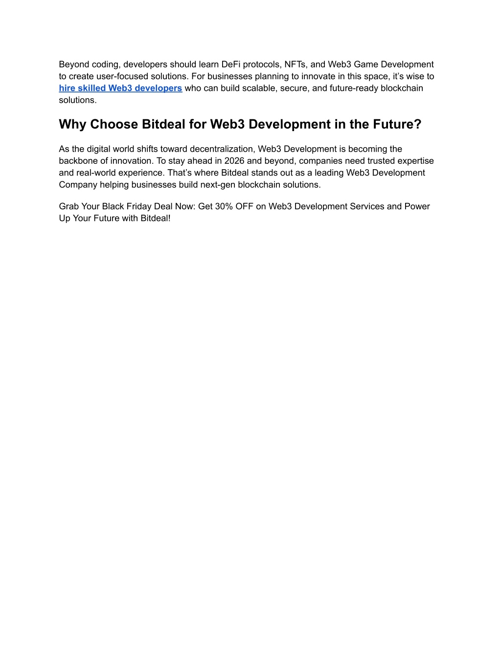 3. Beyond coding, developers should learn DeFi protocols, NFTs, and Web3 Game Development to create user-focused solutions. For businesses planning to innovate in this space, it’s wise to hire skilled Web3 developers who can build scalable, secure, and future-ready blockchain solutions. Why Choose Bitdeal for Web3 Development in the Future? As the digital world shifts toward decentralization, Web3 Development is becoming the backbone of innovation. To stay ahead in 2026 and beyond, companies need trusted expertise and real-world experience. That’s where Bitdeal stands out as a leading Web3 Development Company helping businesses build next-gen blockchain solutions. Grab Your Black Friday Deal Now: Get 30% OFF on Web3 Development Services and Power Up Your Future with Bitdeal!