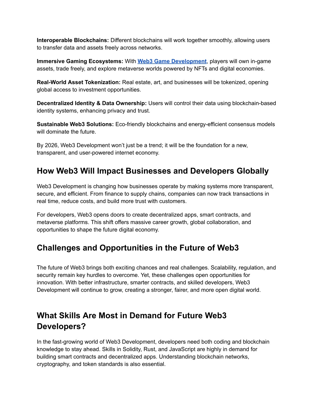 2. Interoperable Blockchains: Different blockchains will work together smoothly, allowing users to transfer data and assets freely across networks. Immersive Gaming Ecosystems: With Web3 Game Development, players will own in-game assets, trade freely, and explore metaverse worlds powered by NFTs and digital economies. Real-World Asset Tokenization: Real estate, art, and businesses will be tokenized, opening global access to investment opportunities. Decentralized Identity & Data Ownership: Users will control their data using blockchain-based identity systems, enhancing privacy and trust. Sustainable Web3 Solutions: Eco-friendly blockchains and energy-efficient consensus models will dominate the future. By 2026, Web3 Development won’t just be a trend; it will be the foundation for a new, transparent, and user-powered internet economy. How Web3 Will Impact Businesses and Developers Globally Web3 Development is changing how businesses operate by making systems more transparent, secure, and efficient. From finance to supply chains, companies can now track transactions in real time, reduce costs, and build more trust with customers. For developers, Web3 opens doors to create decentralized apps, smart contracts, and metaverse platforms. This shift offers massive career growth, global collaboration, and opportunities to shape the future digital economy. Challenges and Opportunities in the Future of Web3 The future of Web3 brings both exciting chances and real challenges. Scalability, regulation, and security remain key hurdles to overcome. Yet, these challenges open opportunities for innovation. With better infrastructure, smarter contracts, and skilled developers, Web3 Development will continue to grow, creating a stronger, fairer, and more open digital world. What Skills Are Most in Demand for Future Web3 Developers? In the fast-growing world of Web3 Development, developers need both coding and blockchain knowledge to stay ahead. Skills in Solidity, Rust, and JavaScript are highly in demand for building smart contracts and decentralized apps. Understanding blockchain networks, cryptography, and token standards is also essential.