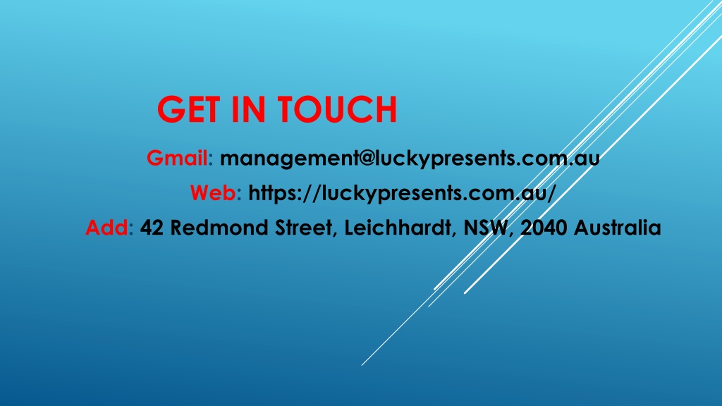 GET IN TOUCH Gmail: management@luckypresents.com.au Web: https://luckypresents.com.au/ Add: 42 Redmond Street, Leichhardt, NSW, 2040 Australia