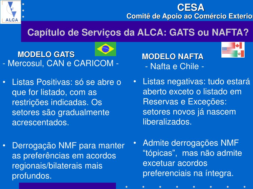MODELO GATS - Mercosul, CAN e CARICOM - Listas Positivas: só se abre o que for listado, com as restrições indicadas. Os setores são gradualmente acrescentados. Derrogação NMF para manter as preferências em acordos regionais/bilaterais mais profundos. MODELO NAFTA - Nafta e Chile - Listas negativas: tudo estará aberto exceto o listado em Reservas e Exceções: setores novos já nascem liberalizados. Admite derrogações NMF “tópicas”, mas não admite excetuar acordos preferenciais na íntegra. Capítulo de Serviços da ALCA: GATS ou NAFTA?