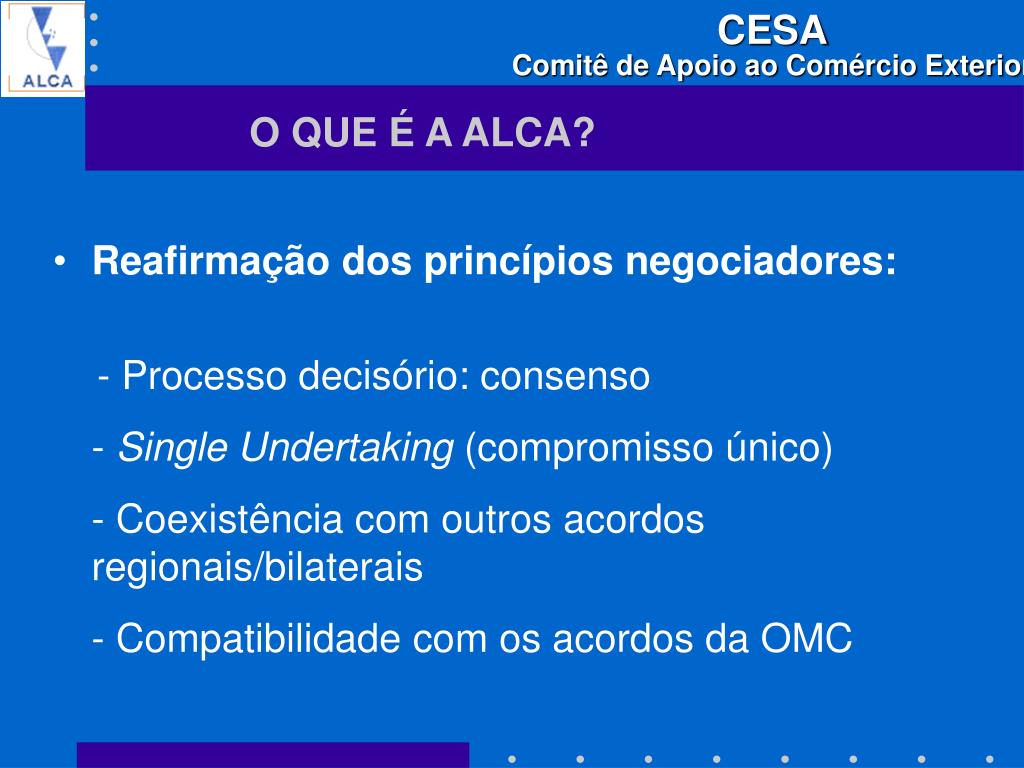 O QUE É A ALCA? • Reafirmação dos princípios negociadores: - Processo decisório: consenso - Single Undertaking (compromisso único) - Coexistência com outros acordos regionais/bilaterais - Compatibilidade com os acordos da OMC