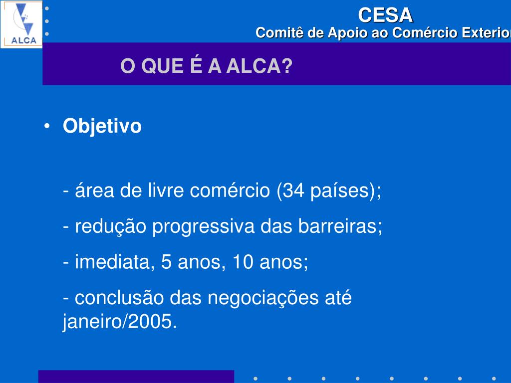 O QUE É A ALCA? • Objetivo - área de livre comércio (34 países); - redução progressiva das barreiras; - imediata, 5 anos, 10 anos; - conclusão das negociações até janeiro/2005.