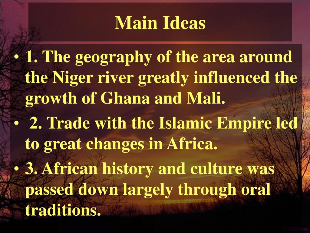 Main Ideas • 1. The geography of the area around the Niger river greatly influenced the growth of Ghana and Mali. • 2. Trade with the Islamic Empire led to great changes in Africa. • 3. African history and culture was passed down largely through oral traditions.