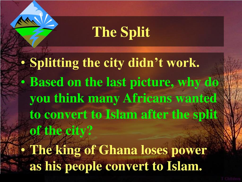 The Split • Splitting the city didn’t work. • Based on the last picture, why do you think many Africans wanted to convert to Islam after the split of the city? • The king of Ghana loses power as his people convert to Islam.
