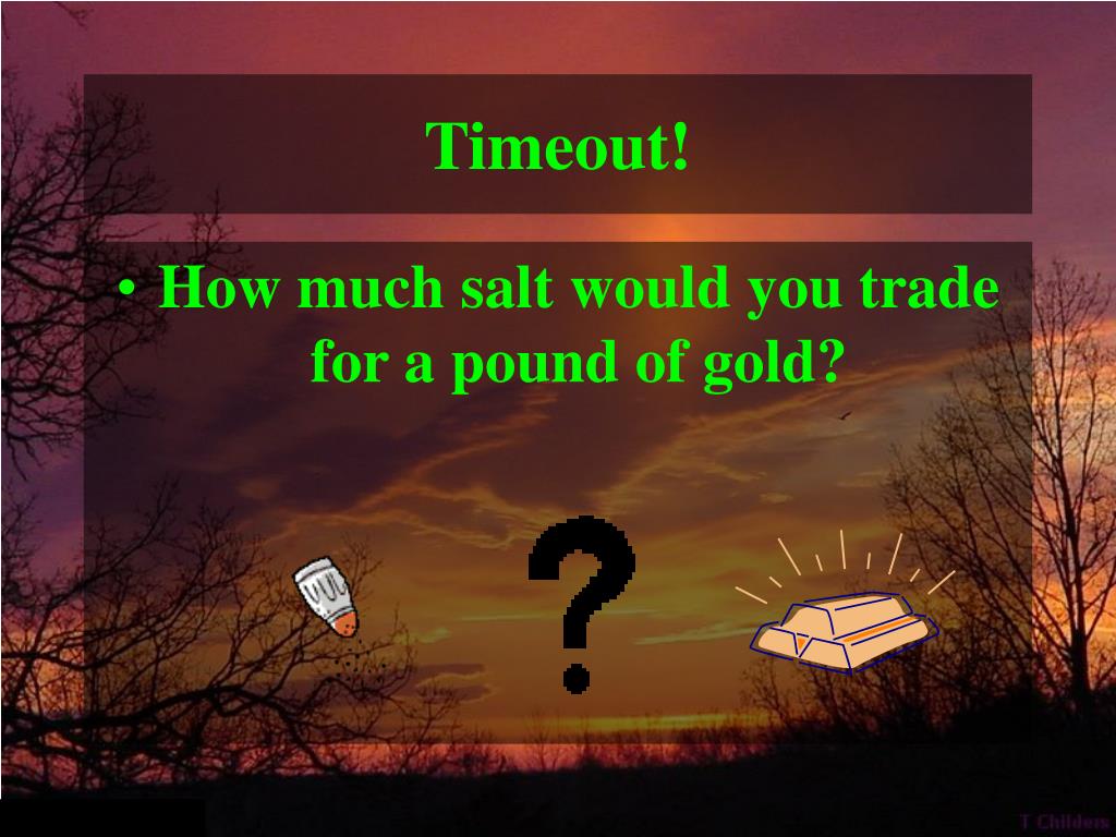 Timeout! • How much salt would you trade for a pound of gold?