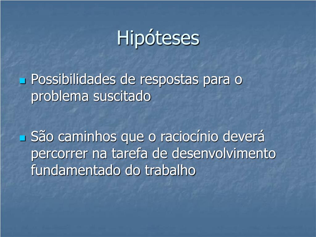 Hipóteses • Possibilidades de respostas para o problema suscitado • São caminhos que o raciocínio deverá percorrer na tarefa de desenvolvimento fundamentado do trabalho