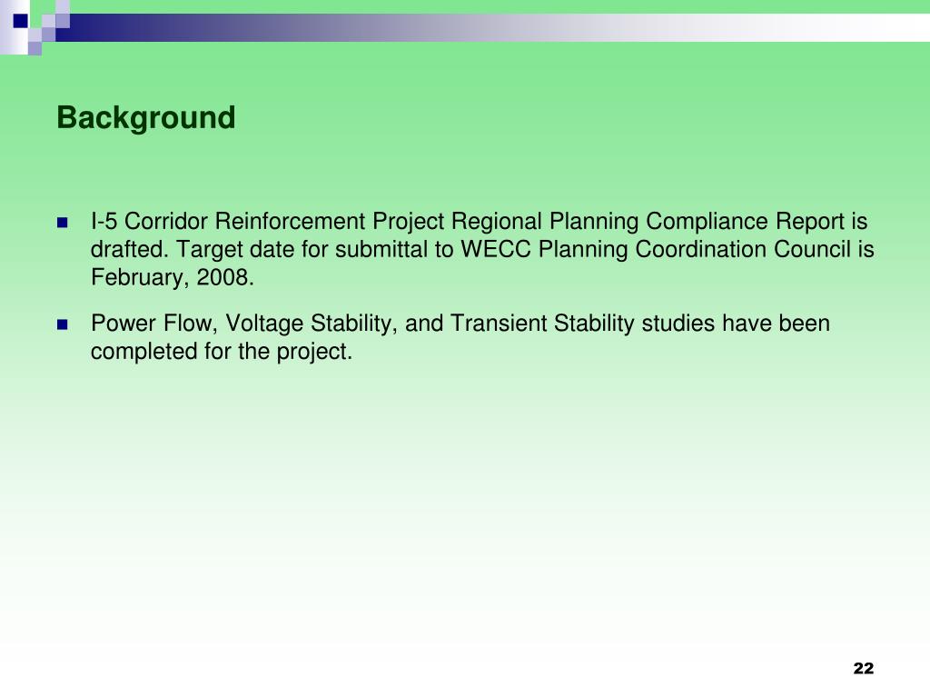 Background • I-5 Corridor Reinforcement Project Regional Planning Compliance Report is drafted. Target date for submittal to WECC Planning Coordination Council is February, 2008. • Power Flow, Voltage Stability, and Transient Stability studies have been completed for the project.
