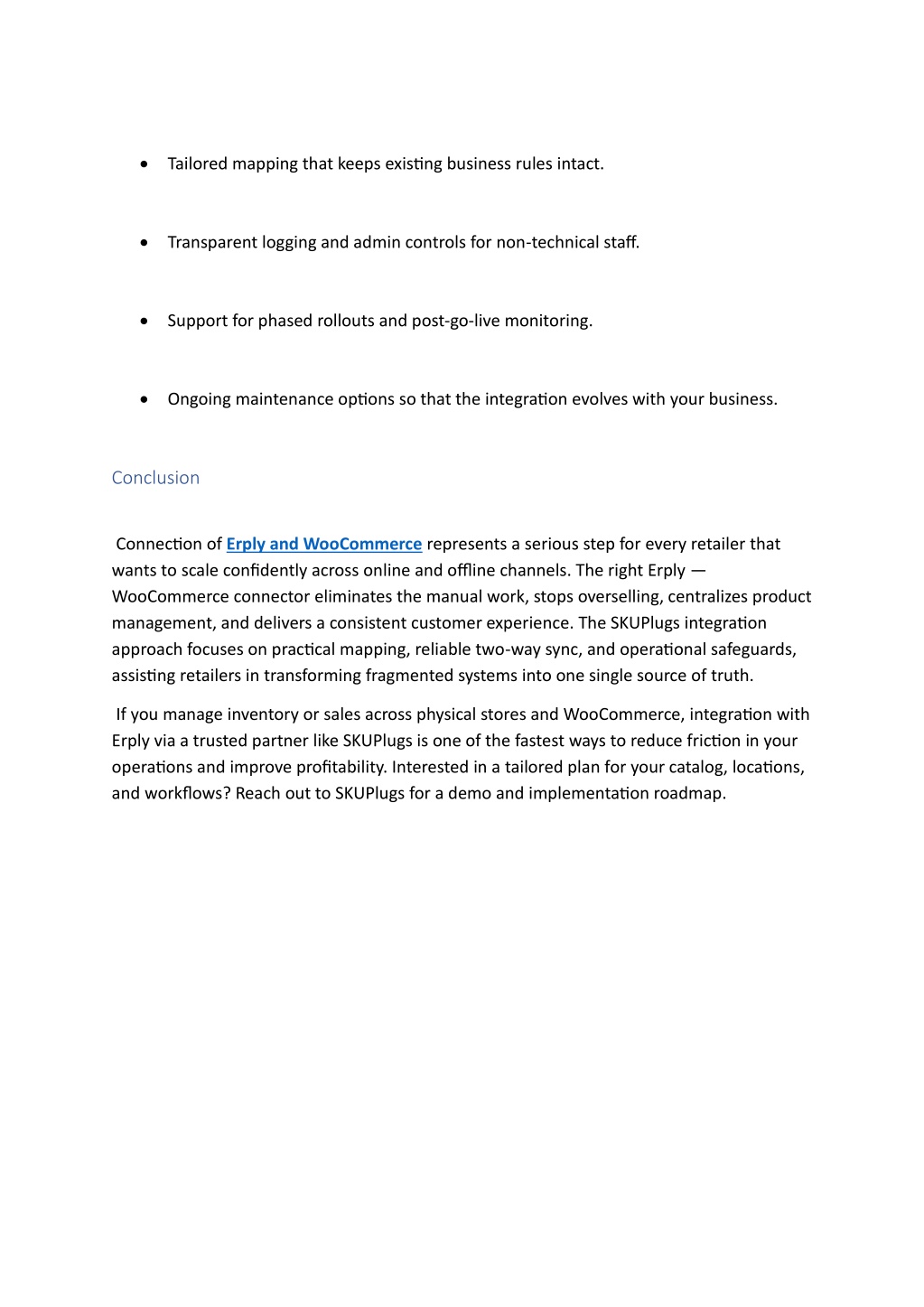•Tailored mapping that keeps existing business rules intact. •Transparent logging and admin controls for non-technical staff. •Support for phased rollouts and post-go-live monitoring. •Ongoing maintenance options so that the integration evolves with your business. Conclusion Connection of Erply and WooCommerce represents a serious step for every retailer that wants to scale confidently across online and offline channels. The right Erply — WooCommerce connector eliminates the manual work, stops overselling, centralizes product management, and delivers a consistent customer experience. The SKUPlugs integration approach focuses on practical mapping, reliable two-way sync, and operational safeguards, assisting retailers in transforming fragmented systems into one single source of truth. If you manage inventory or sales across physical stores and WooCommerce, integration with Erply via a trusted partner like SKUPlugs is one of the fastest ways to reduce friction in your operations and improve profitability. Interested in a tailored plan for your catalog, locations, and workflows? Reach out to SKUPlugs for a demo and implementation roadmap.