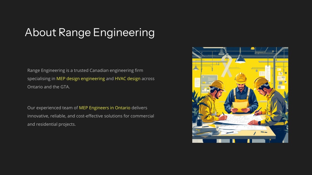 2. About Range Engineering Range Engineering is a trusted Canadian engineering firm specialising in MEP design engineering and HVAC design across Ontario and the GTA. Our experienced team of MEP Engineers in Ontario delivers innovative, reliable, and cost-effective solutions for commercial and residential projects.