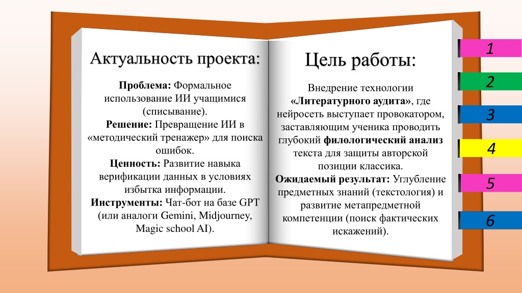 1 2 5 3 4 • Актуальность проекта: • Проблема: Формальное использование ИИ учащимися (списывание). • Решение: Превращение ИИ в «методический тренажер» для поиска ошибок. • Ценность: Развитие навыка верификации данных в условиях избытка информации. • Инструменты: Чат-бот на базе GPT (или аналоги Gemini, Midjourney, Magic school AI). • Цель работы: • Внедрение технологии «Литературного аудита»,где нейросеть выступает провокатором, заставляющим ученика проводить глубокий филологический анализ текста для защиты авторской позиции классика. • Ожидаемый результат: Углубление предметных знаний (текстология) и развитие метапредметной компетенции (поиск фактических искажений).