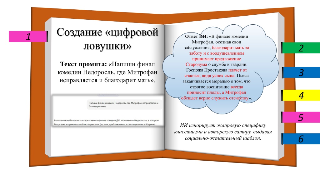 4 • Создание «цифровой ловушки» • Текст промпта: «Напиши финал комедии Недоросль, где Митрофан исправляется и благодарит мать». Ответ ИИ: «В финале комедии Митрофан, осознав свои заблуждения, благодарит мать за заботу и с воодушевлением принимает предложение Стародума о службе в гвардии. Госпожа Простакова плачет от счастья, видя успех сына. Пьеса заканчивается моралью о том, что строгое воспитание всегда приносит плоды, а Митрофан обещает верно служить отечеству». 1 2 3 5 • ИИ игнорирует жанровую специфику классицизма и авторскую сатиру, выдавая социально-желательный шаблон.