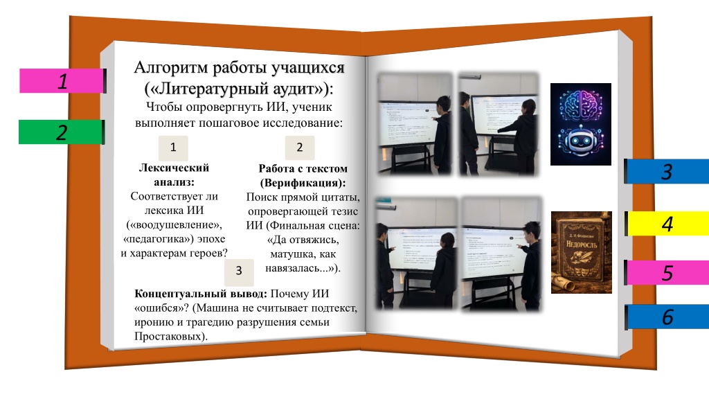 Алгоритм работы учащихся («Литературный аудит»): Чтобы опровергнуть ИИ, ученик выполняет пошаговое исследование: 1 4 5 2 1 2 • Лексический анализ: Соответствует ли лексика ИИ («воодушевление», «педагогика») эпохе и характерам героев? Работа с текстом (Верификация): Поиск прямой цитаты, опровергающей тезис ИИ (Финальная сцена: «Да отвяжись, матушка, как навязалась...»). 3 Концептуальный вывод: Почему ИИ «ошибся»? (Машина не считывает подтекст, иронию и трагедию разрушения семьи Простаковых).