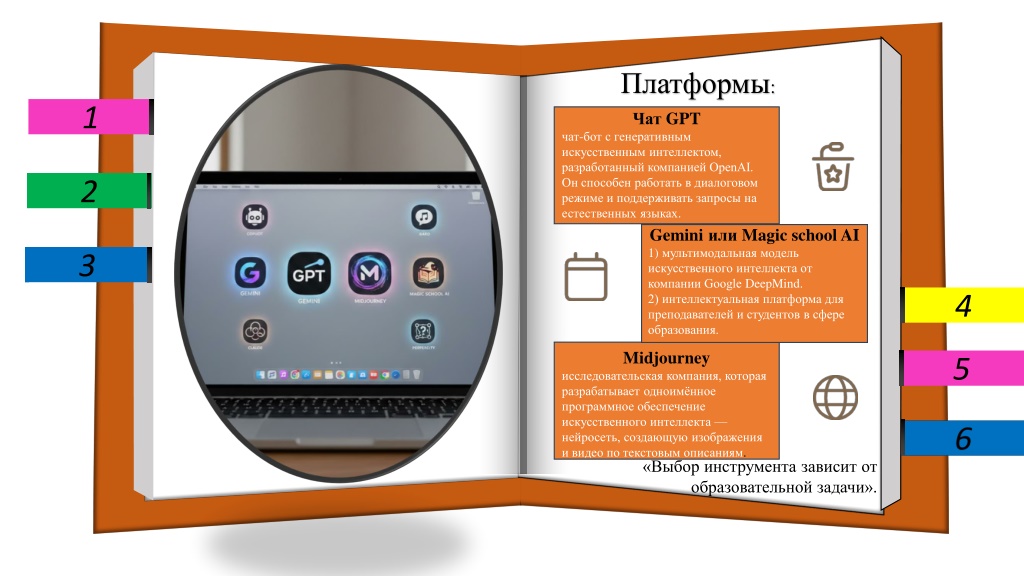 Платформы: 1 3 4 5 2 Чат GPT чат-бот с генеративным искусственным интеллектом, разработанный компанией OpenAI. Он способен работать в диалоговом режиме и поддерживать запросы на естественных языках. Gemini или Magic school AI • 1)мультимодальная модель искусственного интеллекта от компании Google DeepMind. • 2) интеллектуальная платформа для преподавателей и студентов в сфере образования. Midjourney исследовательская компания, которая разрабатывает одноимённое программное обеспечение искусственного интеллекта — нейросеть, создающую изображения и видео по текстовым описаниям. «Выбор инструмента зависит от образовательной задачи».