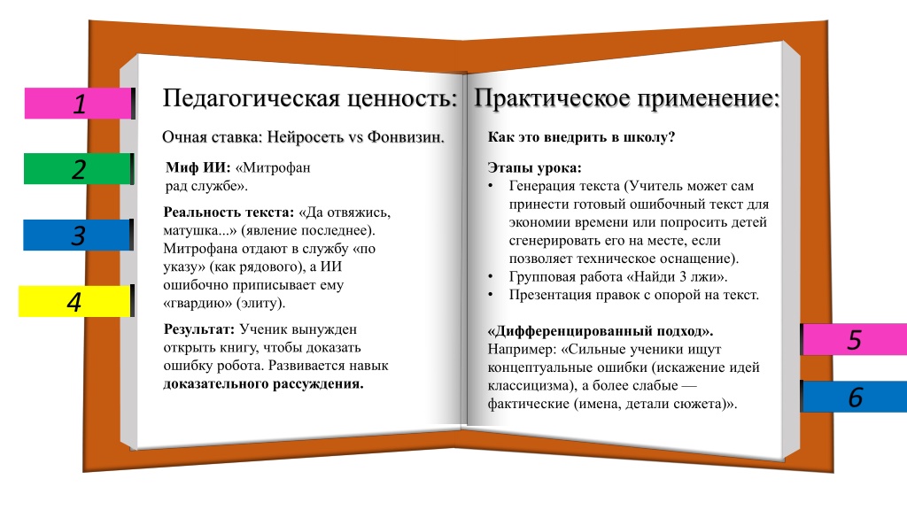 1 4 2 3 Практическое применение: Педагогическая ценность: Очная ставка: Нейросеть vs Фонвизин. • Как это внедрить в школу? • Этапы урока: • Генерация текста (Учитель может сам принести готовый ошибочный текст для экономии времени или попросить детей сгенерировать его на месте, если позволяет техническое оснащение). • Групповая работа «Найди 3 лжи». • Презентация правок с опорой на текст. • «Дифференцированный подход». Например: «Сильные ученики ищут концептуальные ошибки (искажение идей классицизма), а более слабые — фактические (имена, детали сюжета)». Миф ИИ: «Митрофан рад службе». • Реальность текста: «Да отвяжись, матушка...» (явление последнее). Митрофана отдают в службу «по указу» (как рядового), а ИИ ошибочно приписывает ему «гвардию» (элиту). Результат: Ученик вынужден открыть книгу, чтобы доказать ошибку робота. Развивается навык доказательного рассуждения.